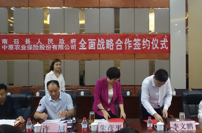 9月7日,南召县人民政府与我公司签订全面战略合作协议。南召县常务副县长李文鹏、中原农险南阳市服务组负责人朱彦平、相关县直单位及15个乡镇负责人出席了签约仪式。