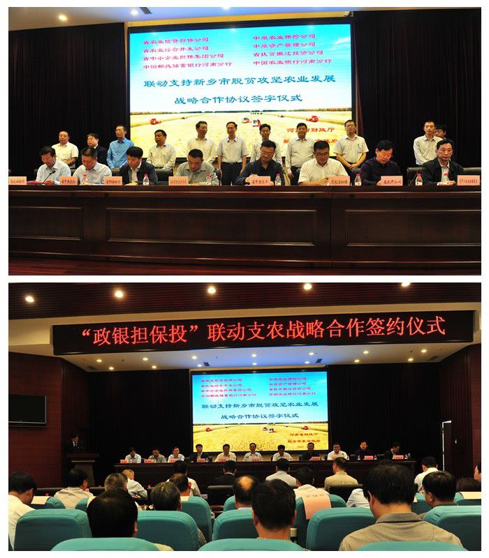 9月 29 日,新乡市各县(市)政府与省农信担保公司、省农开公司、中原农险公司等省属金融机构“政银担保投”联动支农战略合作协议,贫困县金融助推脱贫攻坚合作协议签约暨省农信担公司豫北第一办事处揭牌仪式在新乡市财政局二楼会议室举行。省财政厅副厅长庞学孟、新乡市委书记张国伟、新乡市常务副市长刘尚进等省市领导出席仪式。公司党委书记、董事长毕治军,总裁助理叶强参加会议。毕治军在会议上发表致辞,并代表公司与新乡市各县(市)政府签订“政银担保投”联动支农战略合作协议。