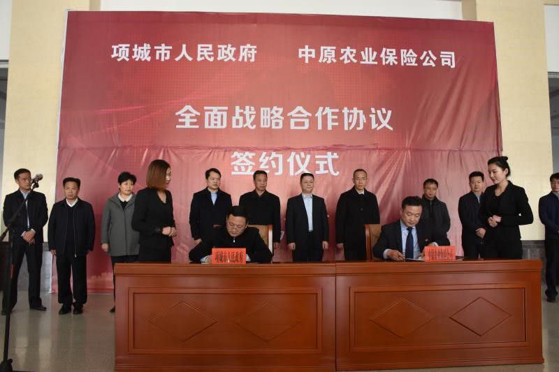 12月7日上午,中原农业保险公司与项城市人民政府全面战略合作协议签约仪式在项城市政府举行,中原农险公司董事长毕治军,周口市政府副市长王少青,周口市政府副秘书长杨峰,市农业局局长戴亮,市深化改革领导小组办公室主任程慎东,中原农险公司行办主任杜亚辉,中原农险周口市分公司总经理梁海涛,项城市委书记刘昌宇、市政府市长王富生、市人大主仼刘体峰、市政协主席王玉玲、市委秘书长毛磊、市政府副市长王拥军出席签约仪式,项城市扶贫办、政府办、金融办等市直部门负责同志及各乡镇党委书记参加签约仪式。