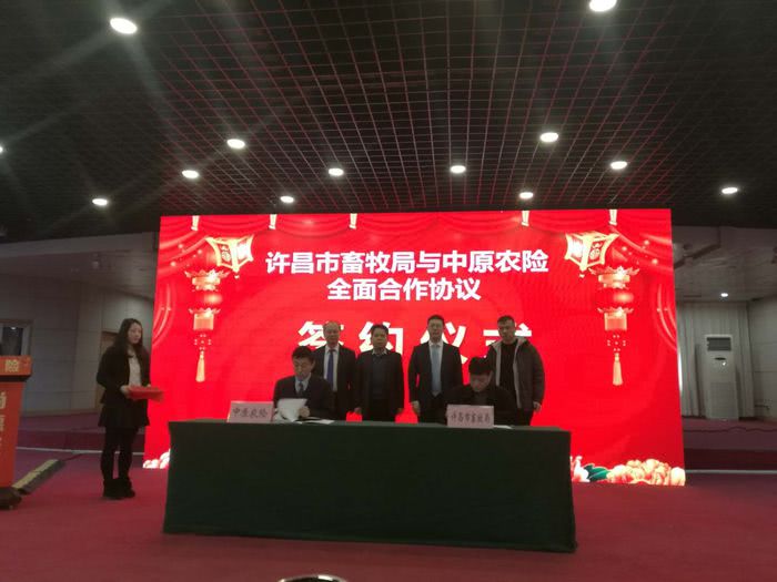 1月29日上午,许昌市畜牧局、中原农险许昌分公司全面战略合作协议签约仪式在许昌市政府3号楼1楼会议室举行。省畜牧局计财处周宪峰处长、许昌市畜牧局局长张德学、副局长李宏杰、公司副总裁鲁启明,公司养殖业保险部总经理冯松、许昌市分公司总经理闫松等人出席签约仪式,各县(市、区)畜牧局长、分管副局长及大型涉牧龙头企业参加签约仪式。