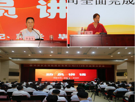 8月27日-28日,公司召开2018年中经营分析会,会议由公司党委副书记、副总裁李惠勇,常务副总裁王成刚主持。公司经营班子、总分公司处级及以上人员、地市机构班子成员、县级机构负责人参加会议。会上,企划部、种植险部、养殖险部、商险部分别对公司1-7月经营情况、各业务条线工作开展情况进行了全面分析。商险条线进行了普惠健康保险业务发展宣导。同时,总公司对河南省分公司签订了统一法人授权书。