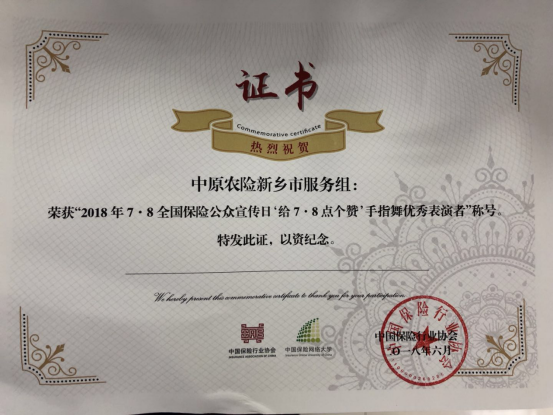 此次宣传活动得到总公司各部门、各分支机构的大力支持,并在行业协会评比中获奖。其中,新乡市服务组组织的“给7·8点个赞”手指舞,荣获中国保险行业协会“给‘7·8点个赞’手指舞优秀表演者”称号。公司获得河南省保险行业协会“‘2018年7·8全国保险公众宣传日’河南保险业宣传大比武‘先进单位’”称号。