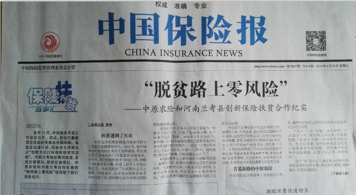 3月25日,中国保险报(2016年3月第3867期)头版头题以《“脱贫路上零风险”——中原农险和河南兰考县创新保险扶贫合作纪实》为题,深入报道了公司与兰考县政府合作的保险扶贫项目。