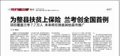 3月22日,新华社以“河南兰考2万多贫困户将领取‘脱贫保单’”为题,报道了兰考扶贫项目。凤凰网、中国网、环球网、央广网、解放网等数十家网站转载了有关兰考保险扶贫模式的报道,引起高度关注。