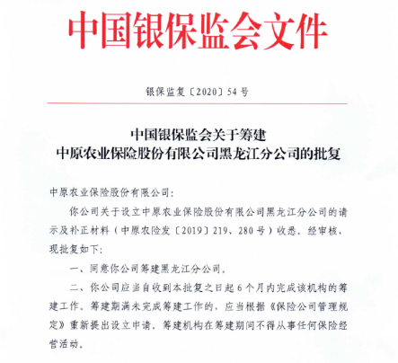 2020年1月22日,中国银保监会下发《关于筹建168飞艇官网直播黑龙江分公司的批复》(银保监复〔2020〕54号),同意我公司筹建黑龙江分公司。