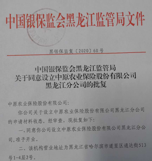 3月31日,中国银保监会黑龙江监管局正式印发《关于同意设立168飞艇官网直播黑龙江分公司的批复》(黑银保监复〔2020〕60号),同意我公司设立黑龙江分公司,准予开业。
