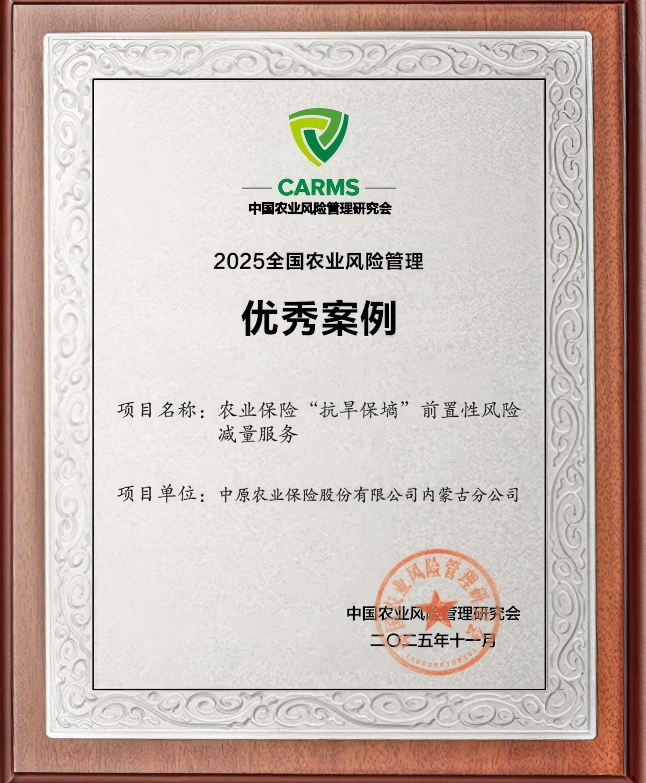 日前,由中国农业风险管理研究会举办的“中国农业风险管理研究会2025年学术年会暨首届农业防灾减灾科技论坛”在杭州召开。中原农险内蒙古分公司申报的“农业保险‘抗旱保墒’前置性风险减量服务”项目,入选“2025年全国农业风险管理优秀案例”。