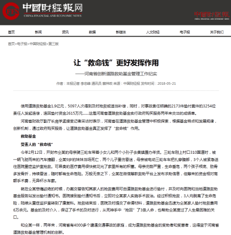 5月21日,中国财经报对我省道路救助基金进行了报道,并对河南省财政厅及道路救助基金管理中心领导进行了访问。省财政厅副厅长庞学孟在接受记者采访时表示,河南省在道路救助基金管理中积极探索,根据救助基金特点和发展规律,创新机制,通过政府购买服务,让道路救助基金真正发挥了“救命钱”作用。