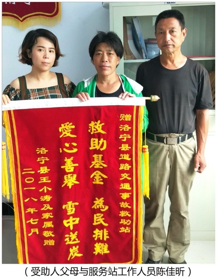 7月12日下午,基金受助人王某涛的父母将一面印有“爱心善举雪中送炭 救助基金为民排难”的锦旗送到中原农险洛宁县服务站。患者家属泪流满面的拉着陈佳昕的手不停道谢,感谢救助基金给了他们孩子第二次生命,感谢政府为这个漂泊在外、靠贩卖蔬菜维持生计的家庭送去了温暖和希望。