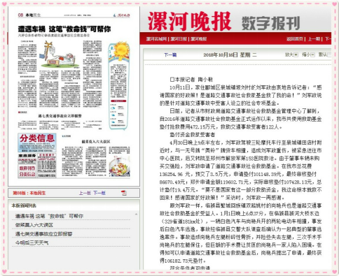 为进一步加强漯河地区道路救助基金社会影响力,充分保障交通事故受害人合法权益,漯河市财政局、公司漯河市服务站联合当地记者,对道路救助基金政策及漯河市救助基金使用情况在漯河晚报进行了专题报道,获得了群众的认可与赞誉。具体报道如下: