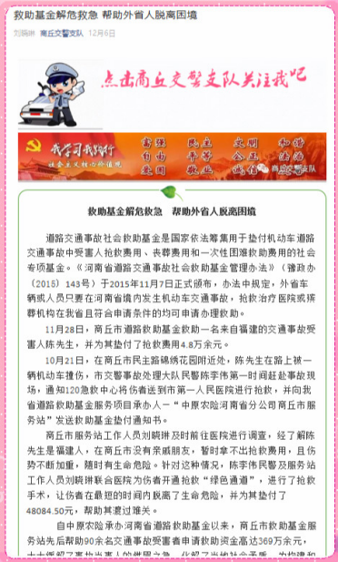 11月28日,商丘市道路救助基金救助一名来自福建的交通事故受害人陈先生,并为其垫付了抢救费用4.8万余元。