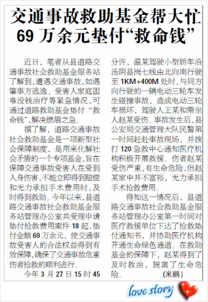 12月初,笔者从汤阴县道路交通事故社会救助基金服务站了解到,遭遇交通事故,如遇肇事方逃逸、受害人家庭苦难没钱抢救等紧急情况,可通过道路救助基金垫付“救命钱”,解决燃眉之急。