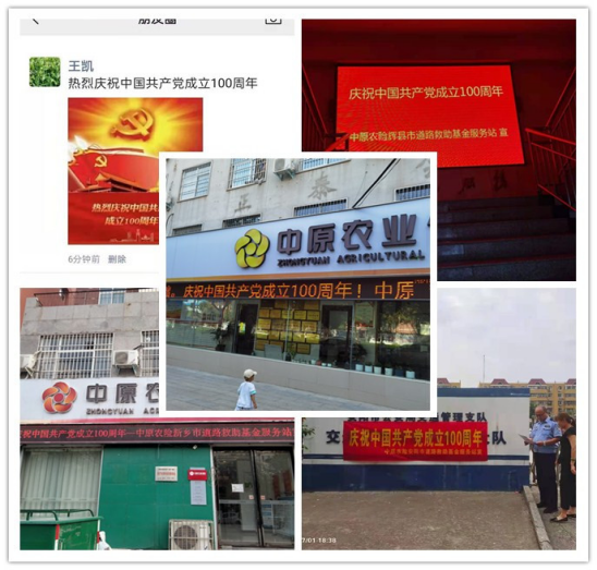 同祝建党百年华诞。道路救助基金服务中心,市、县服务站三级联动,在中原农险分支机构和服务站悬挂庆祝建党100周年的庆祝标语,积极营造庆祝建党100周年浓厚宣传氛围。