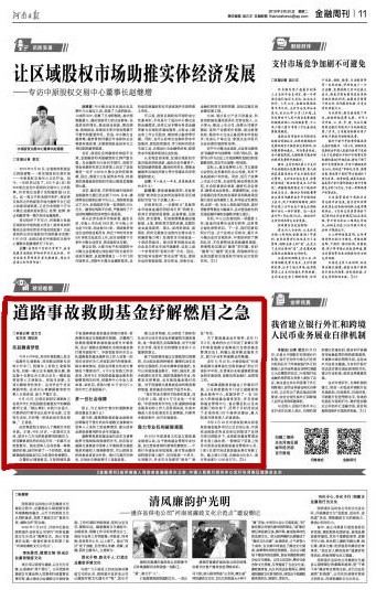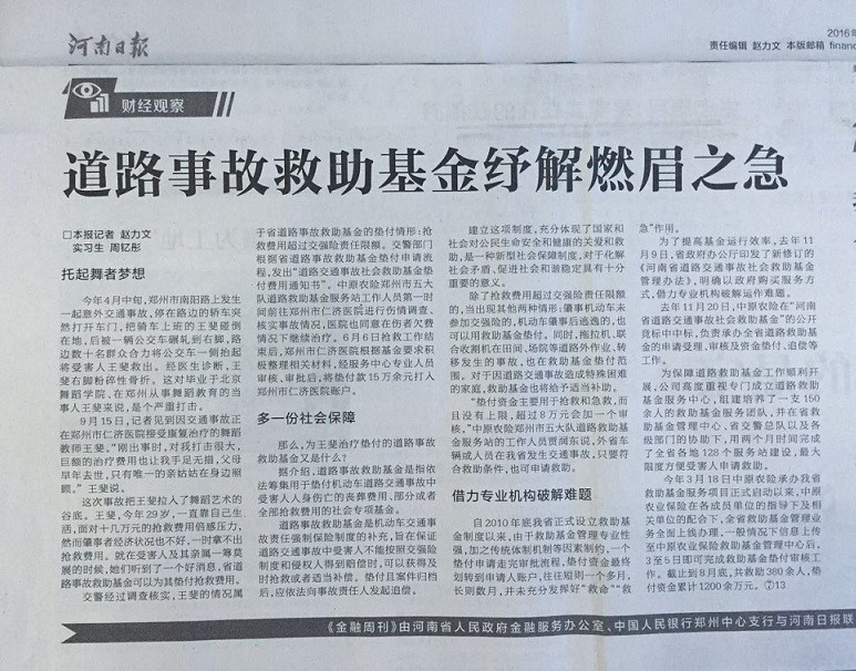 9月20日,河南日报11版—金融周刊,对中原农险道路救助基金工作进行了专题报道。文中,对道路救助基金受助人王女士的救助经过及道路救助基金政策及运行模式做了详细的报道。并就3月18日公司承办道路救助基金服务项目以来,全省救助情况进行了介绍。