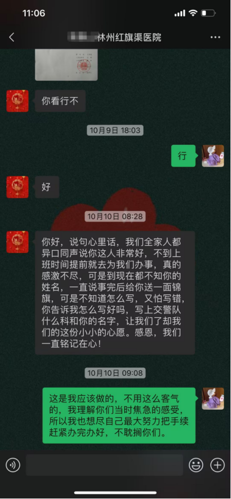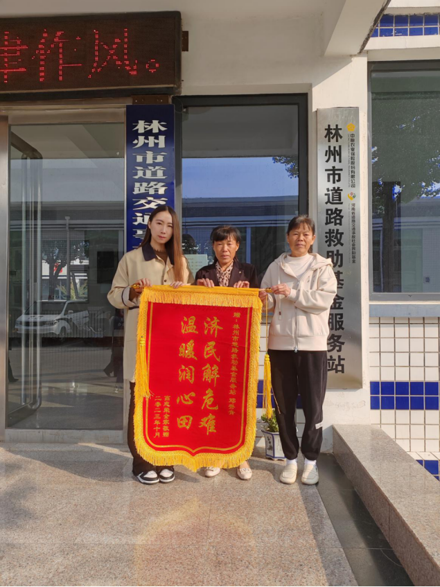 2023年10月11日早上,受助人高某的女儿将一面印有“济民解危难,温暖润心田”的锦旗送到林州市交警大队和林州市道路救助基金服务网点工作人员手中,以表达对交警和救助基金工作人员暖心服务的感谢。