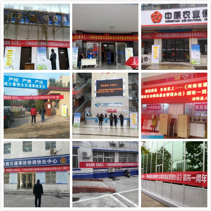 全省各市县道路救助基金服务站通过多种渠道开展宣传活动。在交警、医疗机构、公司职场等地悬挂横幅、设置宣传展台,摆放道路救助基金宣传册及易拉宝,利用LED屏播放一周年宣传语等方式进行。