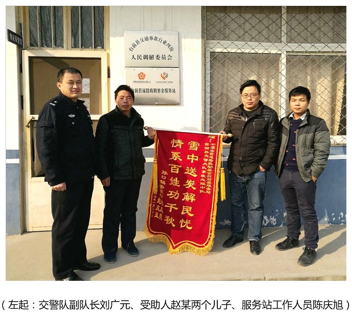 2017年1月23日,公司台前县道路救助基金服务站收到了一面印有“雪中送炭解民忧 情系百姓功千秋”的锦旗,受助人赵某的两个儿子向服务站工作人员表达了他们对救助基金的感激之情。