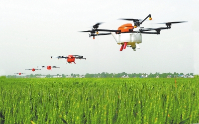 今年5月,无人机在唐河县麦田里进行“一喷三防”作业。资料图片