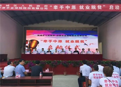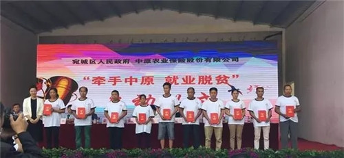 宛城区区长樊牛代表宛城区政府与中原农险签订《就业扶贫合作协议》,将所有种植户种植的小麦、花生全部纳入保险范围,种植户承担20%的保费由区财政负担,实现能保尽保、应保尽保。同时,中原农险为宛城区提供1500个就业岗位,其中聘请建档立卡贫困户1312人作为助理协保员和宣传员,贫困户实现就业脱贫。