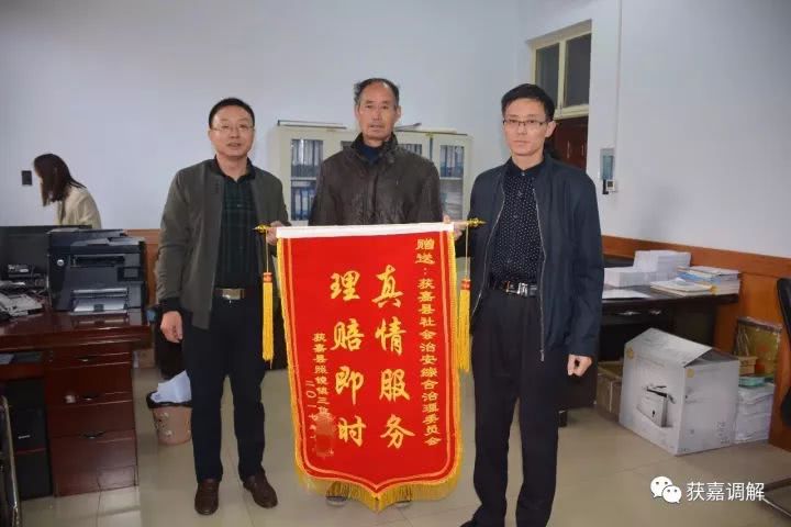10月19日上午,照镜镇三位村村民刘某与中原农业保险的工作人员一道来到县综治办,激动地将一面锦旗送到县综治办,感激县委、县政府给全县人民购买了社会治安保险,让他获得了意外之喜。