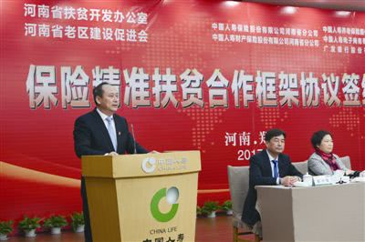 2017年3月,河南省政府扶贫办与中国人寿驻豫4家机构在郑州签署保险精准扶贫合作框架协议。中国人寿业务总监、河南国寿总经理王新生致词。 刘富安/摄