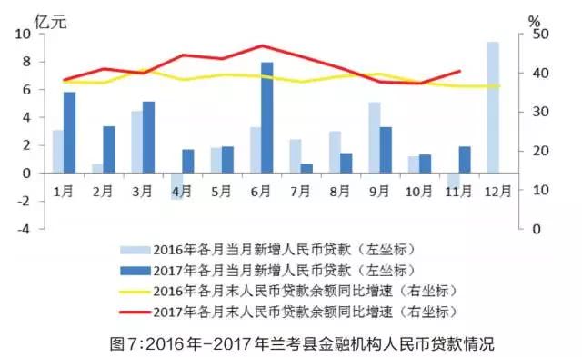 4.薄弱领域利率下行,定向发力效应初显。2017年,整体利率水平趋于稳定,涉农、小微企业贷款利率水平下行。11月末,兰考县法人金融机构小微企业贷款加权平均利率为8.2%,同比下降2个百分点。再贷款、再贴现、定向降准、财税扶持政策效应已经显现。