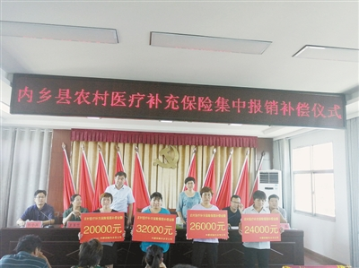 本报讯 (记者冉园园)“交30元,报了26000元,再也不怕看不起病了!”8月16日,内乡县王店镇杨桂村村民冯翠花接过医疗保险补偿款,感动之情溢于言表。当天,中原农险农村医疗补充保险补偿金首批发放,作为中原农险医疗补充险在内乡县试点的两个乡镇之一,王店镇首批受惠农民288人,共领取118.99万元补偿款。