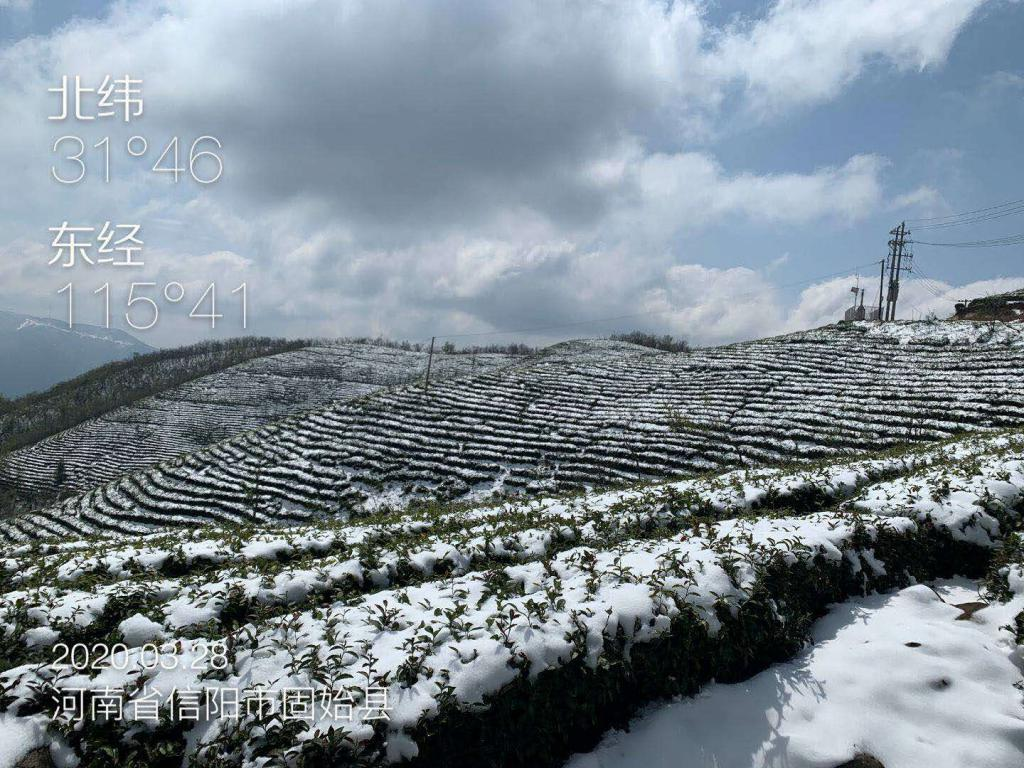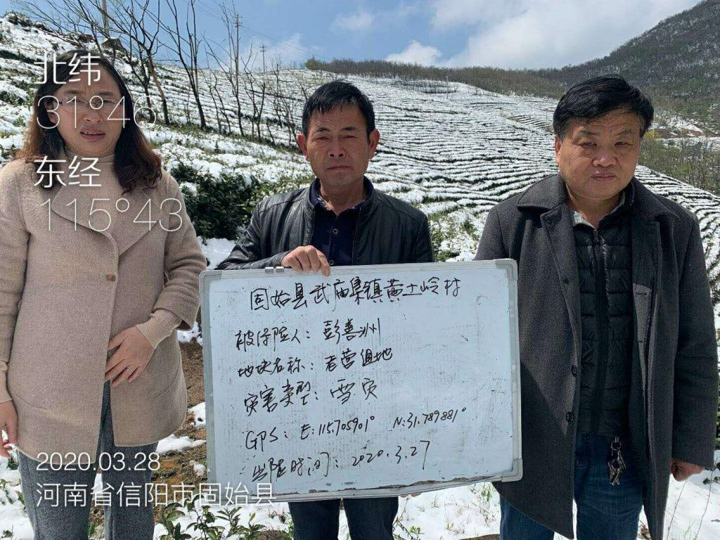 2020 年 3 月 27 日夜,固始县遭受十几年一遇的倒春寒,气温骤降,南部山区下起了中雪。客户黄朝江、彭善洲向中原农险固始县支公司报案,他们所投保的茶园受此次天气影响,正值采摘期的茶树嫩芽遭受冻害,茶叶产量和品质出现不同程度下降。
