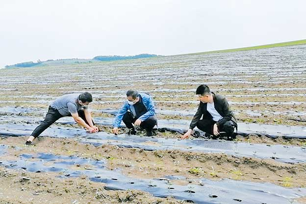 中原农险黑龙江分公司工作人员在黑龙江省鸡东县哈达镇小辣椒地里验标。 代江辉/摄