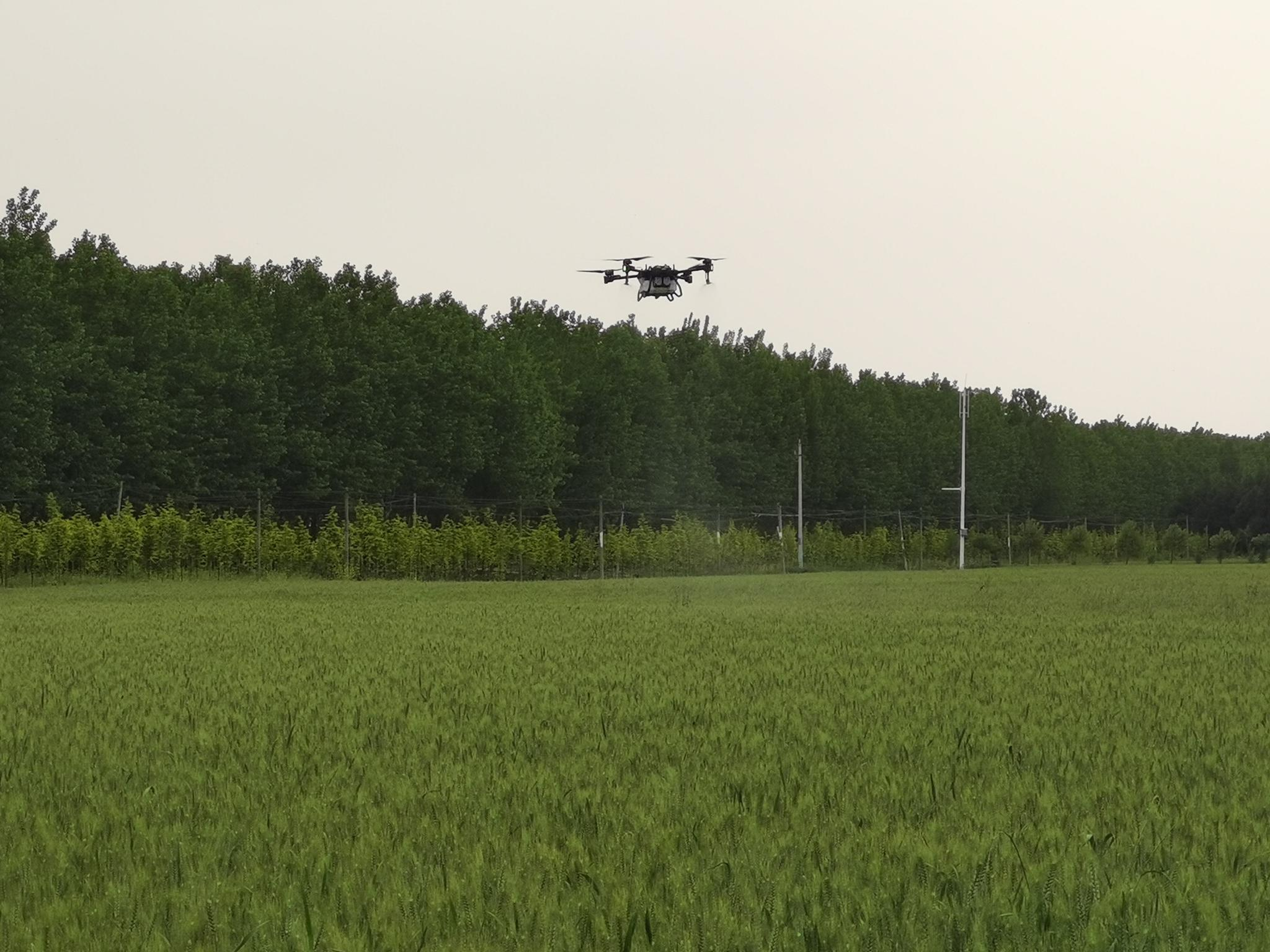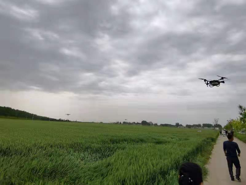 简短的仪式结束后,操作人员轻轻拨动手中的控制器按钮,伴随着“嗡嗡”的轰鸣声,8架无人机腾空而起飞向麦田,在空中一字排开,由近及远开始喷洒作业,喷出的雾状除虫剂均匀地洒在小麦上。“这无人机喷得快还均匀,我们省钱省力,人家中原农险出钱给我们地里的小麦防治病虫害,真是办了一件大好事呀!”村民指着空中的无人机说。