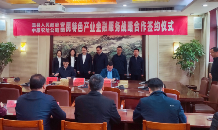 【大河财立方 记者 徐兵 实习生 刘豫 通讯员 王晨】牡丹花开春意浓,乡村振兴正当时。4月26日,中原农险公司与嵩县人民政府富民特色产业金融服务战略合作协议签订仪式在洛阳嵩县举行。嵩县县长辛俊峰,副县长史志锋、王清亮,中原农险公司总监,河南省分公司党委书记、总经理杜亚辉出席签约现场。
