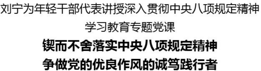 刘宁强调,年轻干部是党和国家事业发展的生力军。党中央开展学习教育,是对广大干部贯彻中央八项规定精神的一次全面政治体检,希望大家不断提高政治判断力、政治领悟力、政治执行力,持续加强政治历练、思想淬炼、实践锻炼、专业训练,做党的优良作风的诚笃践行者。要锤炼党性修养,自觉加强理论武装、党内政治生活淬炼和道德修养,筑牢弘扬优良作风的党性根基。要密切联系群众,坚持以人民为中心,站稳群众立场,做好群众工作,维护群众利益,着力为群众办实事、解难题。要勇于担当作为,树立和践行正确政绩观,不断提升能力本领,做到谋划工作实、制定措施实、政策落地实、服务企业实、解决问题实。要培育良好习惯,保持严肃的生活作风,从严落实“十严禁”要求,对违规吃喝问题露头就打、反复敲打、人人喊打。要永葆清廉本色,常怀敬畏之心,坚持交友原则,涵养良好家风,牢牢守住廉洁自律底线。